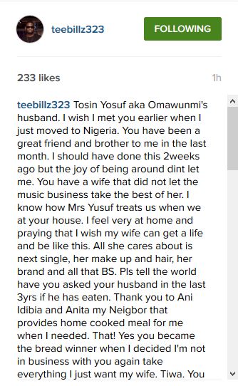 "Tosin Yosuf aka Omawunmi's husband. I wish I met you earlier when I just moved to Nigeria. You have been a great friend and brother to me in the last month. I should have done this 2weeks ago but the joy of being around dint let me. You have a wife that did not let the music business take the best of her. I know how Mrs Yusuf treats us when we at your house. I feel very at home and praying that I wish my wife can get a life and be like this. All she cares about is next single, her make up and hair, her brand and all that BS. Pls tell the world have you asked your husband in the last 3yrs if he has eaten. Thank you to Ani Idibia and Anita my Neigbor that provides home cooked meal for me when I needed. That! Yes you became the bread winner when I decided I'm not in business with you again take everything I just want my wife. Tiwa. You will never have peace except my spirits forgives you. Tell your mother to confess what she mounted in the house for you to shine with my star. It's deeper than what you think."