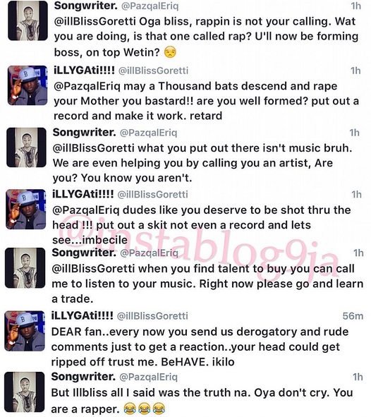 "May a thousand bats rape your mother,"...Popular Nigerian rapper, illBLiss, decrees, as he blocks tweeter who says rapping isn't his calling, in another Twitter rant by a celebrity.